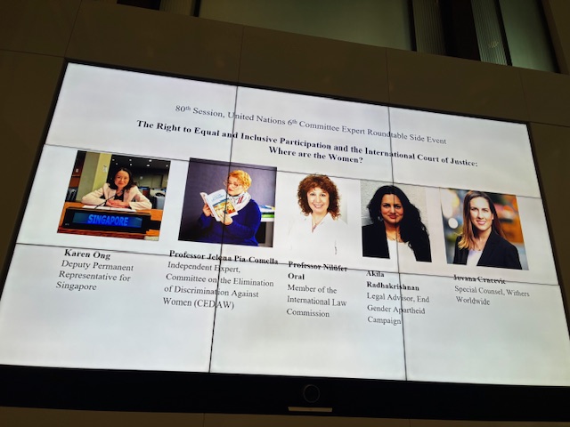 Since its inception in 1945, there has been only six female judges on the bench of the ICJ. In the upcoming ICJ judicial elections, out of eleven candidates thus far nominated by states, only three are women. The side event, which featured remarks by a slate of distinguished panelists, stressed the need for equal and inclusive participation for women on the ICJ’s judicial bench, as a fundamental human right. Professor Sterio moderated the discussion along with Dr. Jessica Corsi (University College London). Expert panelists included Karen Ong, Deputy Permanent Representative of Singapore to the United Nations, Prof. Nilufer Oral, International Law Commission, Prof. Jelena Pia-Commella, Member of the Commission of the Elimination of Discrimination Against Women Committee, Jelena Crncevic, Special Counsel, Withers Worldwide, and Akhila Radhakrishnan, End Gender Apartheid Campaign.